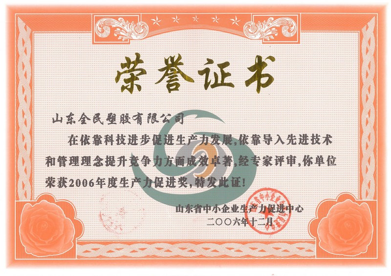 省級生產(chǎn)力促進獎榮譽證書2006.12