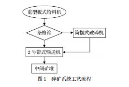 該礦碎礦系統(tǒng)工藝流程如圖1所示,設(shè)備布置如圖2所示,來料首先通過條格篩進(jìn)行篩選。