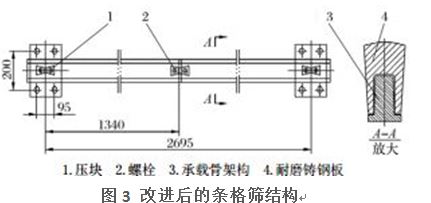 針對條格篩在生產(chǎn)中存在的問題,對格篩條進(jìn)行了改進(jìn)設(shè)計(jì),改進(jìn)后的條格篩主要由耐磨構(gòu)件和承載骨架構(gòu)件兩大部分組成,如圖3所示。