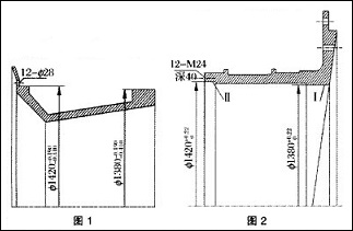 以Φ4000×1400濕式自磨機(jī)為例。濕式自磨機(jī)進(jìn)料部由進(jìn)料襯套和中空軸組成,它們的結(jié)構(gòu)分別如圖1和圖2所示,該結(jié)構(gòu)有兩個配合面,為Φ1380面和Φ1420面,進(jìn)料襯套上的兩個配合面公差均為-0.410~-0.190,中空軸上的兩個配合面公差為0~+0.220,兩個相對應(yīng)的配合面之間所形成的配合間隙大為0.63,小為0.19,中空軸前端有12個周布的、深度為40的M24內(nèi)螺紋孔,與進(jìn)料襯套上的12個Φ28孔相對應(yīng),中空軸和進(jìn)料襯套之間就用這12根M24 的螺桿進(jìn)行聯(lián)接,進(jìn)料襯套以這l2根螺桿進(jìn)行軸向固定,依靠兩個配合臺面進(jìn)行徑向固定,進(jìn)料襯套的運(yùn)動則通過這l2根螺桿來傳遞。